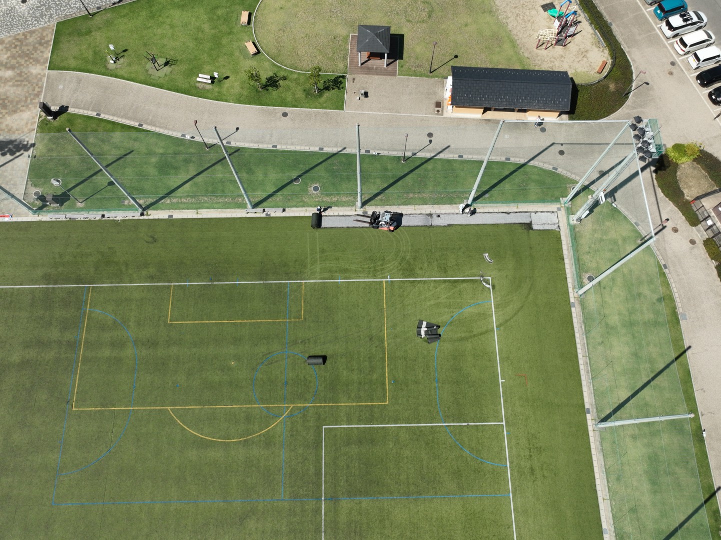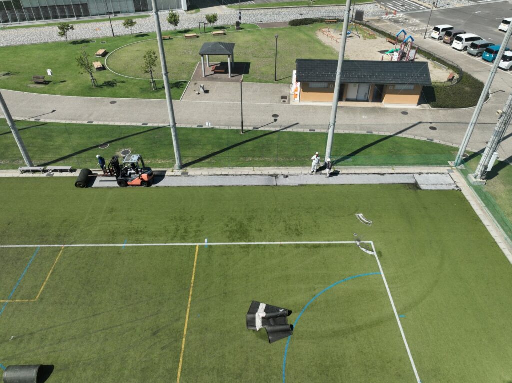 9/16~9/25までの人工芝の張替えの様子です!ほぼほぼ人工芝を剥がすとこは終わり、下地のフェルト(白いとこ)のようなマットを剥がし始めてます!